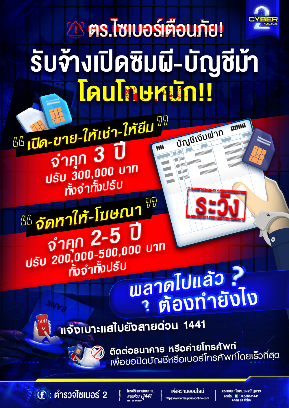 ตร.ไซเบอร์ 2 เตือนภัย❗️รับจ้างเปิดซิมผี-บัญชีม้า โดนโทษหนัก ทั้งโดนปรับ หรืออาจถึงขั้นติดคุก‼️ . บัญ