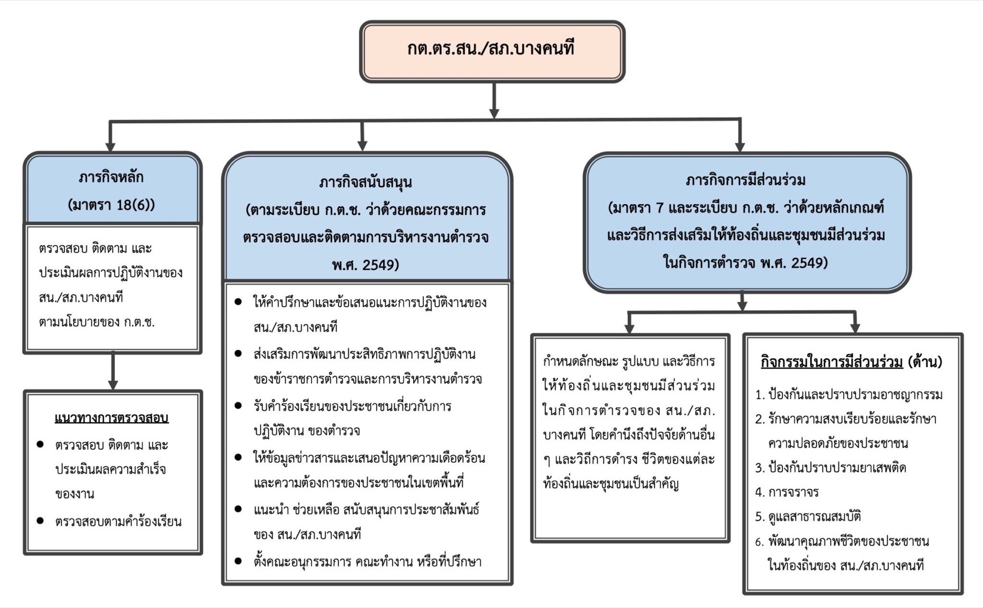 1. ภารกิจหลัก ตามมาตรา 18 (6 แห่ง พ.ร.บ.ตำรวจแห่งชาติ พ.ศ. 2547 กำหนดให้ กต.ตร.กทม. กต.ตร.จังหวัดและ กต.ตร.สถานีตำรวจ มีบทบาทภารกิจในการตรวจสอบ ติดตามและประเมินผลการปฏิบัติงานของ บช.น. / ภ.จว. ให้เป็นไปตามนโยบายของ ก.ต.ช. และการบริหารราชการตำรวจให้เป็นไปตาม พ.ร.บ.ตำรวจแห่งชาติ และกฎหมายอื่น ซึ่ง ก.ต.ช. ได้กำหนดอำนาจหน้าที่ของ กต.ตร.กทม,/จังหวัด และสถานีตำรวจในเรื่องดังกล่าว ไว้ในระเบียบ ก.ต.ช. ว่าด้วยคณะกรรมการตรวจสอบและติดตามการบริหารงานตำรวจ พ.ศ. 2549